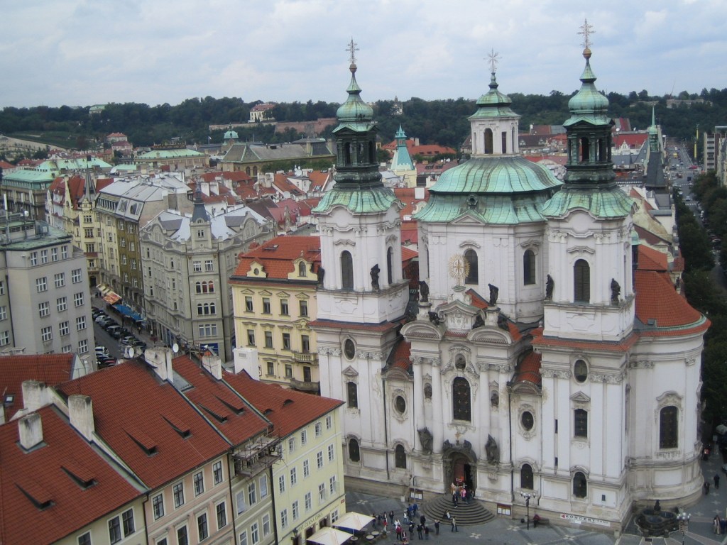 The 14th century Church of Our Lady before Týn from high up the clock tower:
