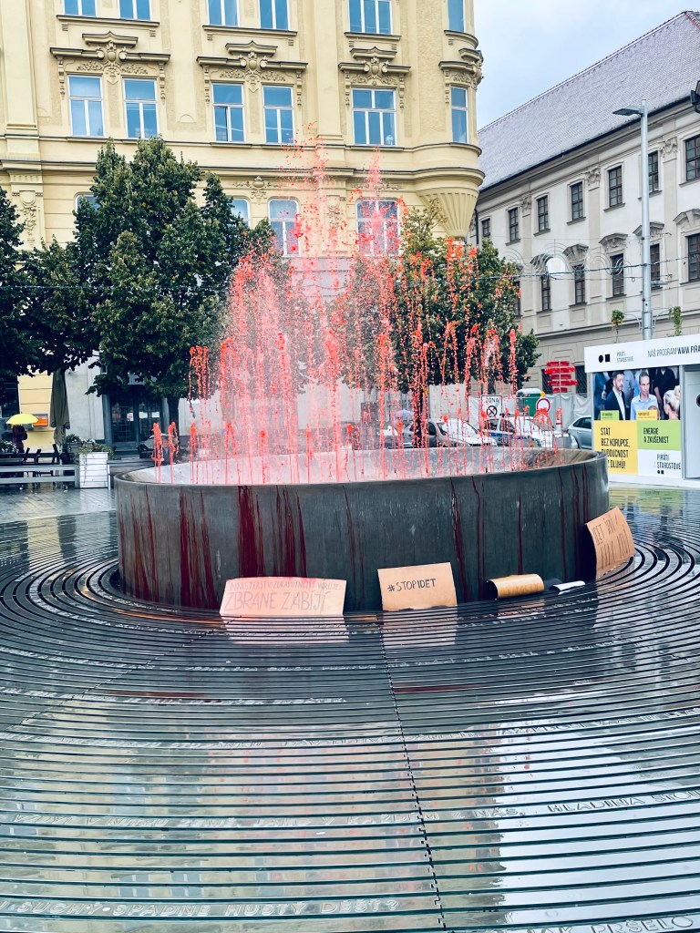 There was an arms fare going on somewhere in Europe and the locals showed their disgust by dying the water in the town square: